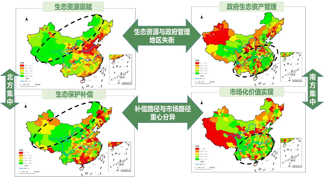 According to the index, the top 10 cities are Chongqing, Nanping, Beijing, Yichang, Hulunbeier, Aba Tibetan and Qiang Autonomous Prefecture, Hainan Tibetan Autonomous Prefecture, Huangshan City, and Haixi Mongol and Tibetan Autonomous Prefecture, and Ganzi Tibetan Autonomous Prefecture. Based on the sub-index scores of the four major areas, the 337 cities can be divided into five types according to their respective strengths in ecological asset management: ecological resource endowment-marketable value realization type (e.g., Chongqing, Ganzi, Liangshan, and Jiuquan, etc.), ecological resource endowment-ecological protection compensation type (e.g., Hulunbeier, Haixi, and Yushu, etc.), government ecological asset management-ecological protection compensation type (e.g., Zhangye , Golo, Huangnan, etc.), government ecological asset management-market-based value realization type (e.g., Nanping, Beijing, Huangshan, Tianjin, etc.), and the balanced type in four major areas (e.g., Hainan State, Aba, Pu'er, etc.).
