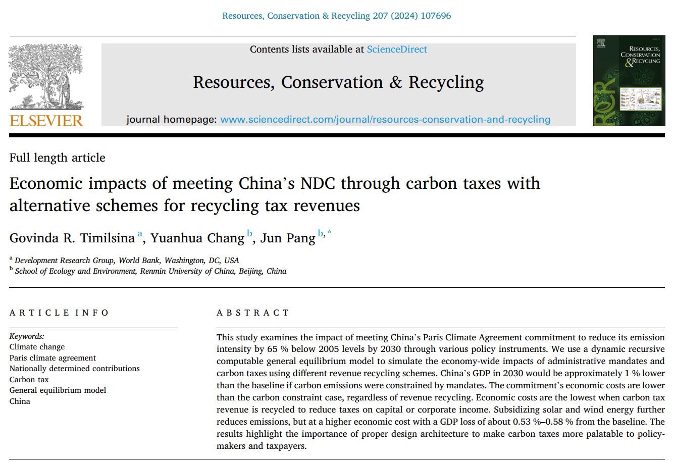 Jun Pang et al:Economic impacts of meeting China's NDC through carbon taxes with alternative schemes for recycling tax revenues